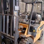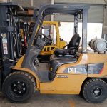 Montacargas seminuevo de la marca Caterpillar. Cuenta con tanque de gas LP incluido y llantas neumáticas.