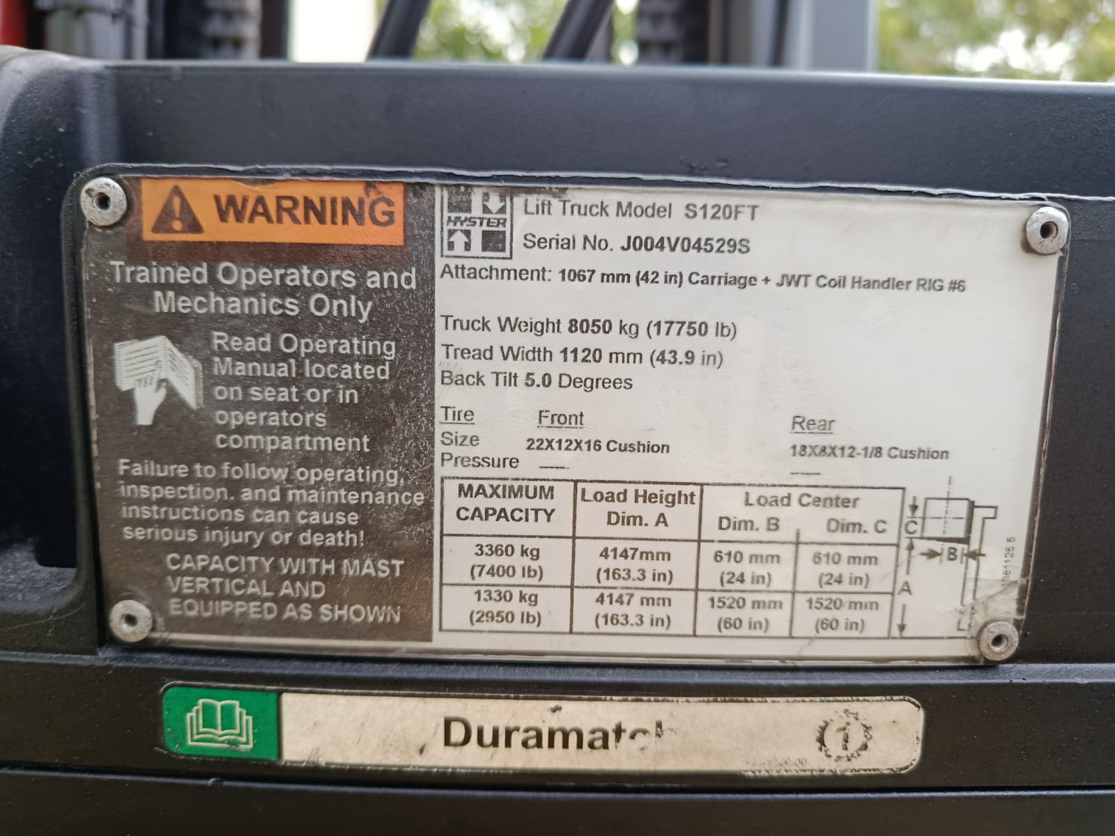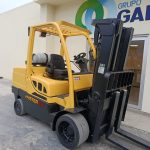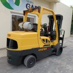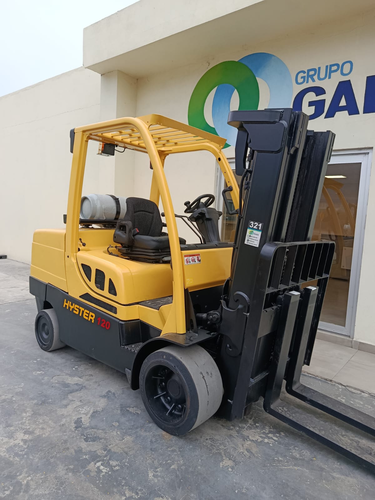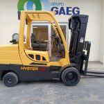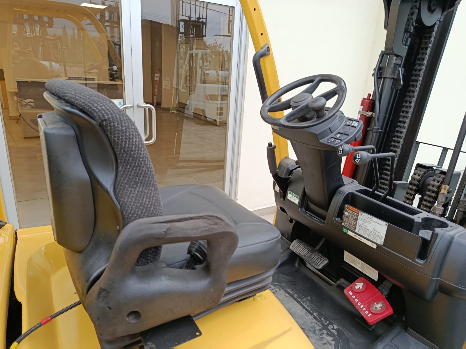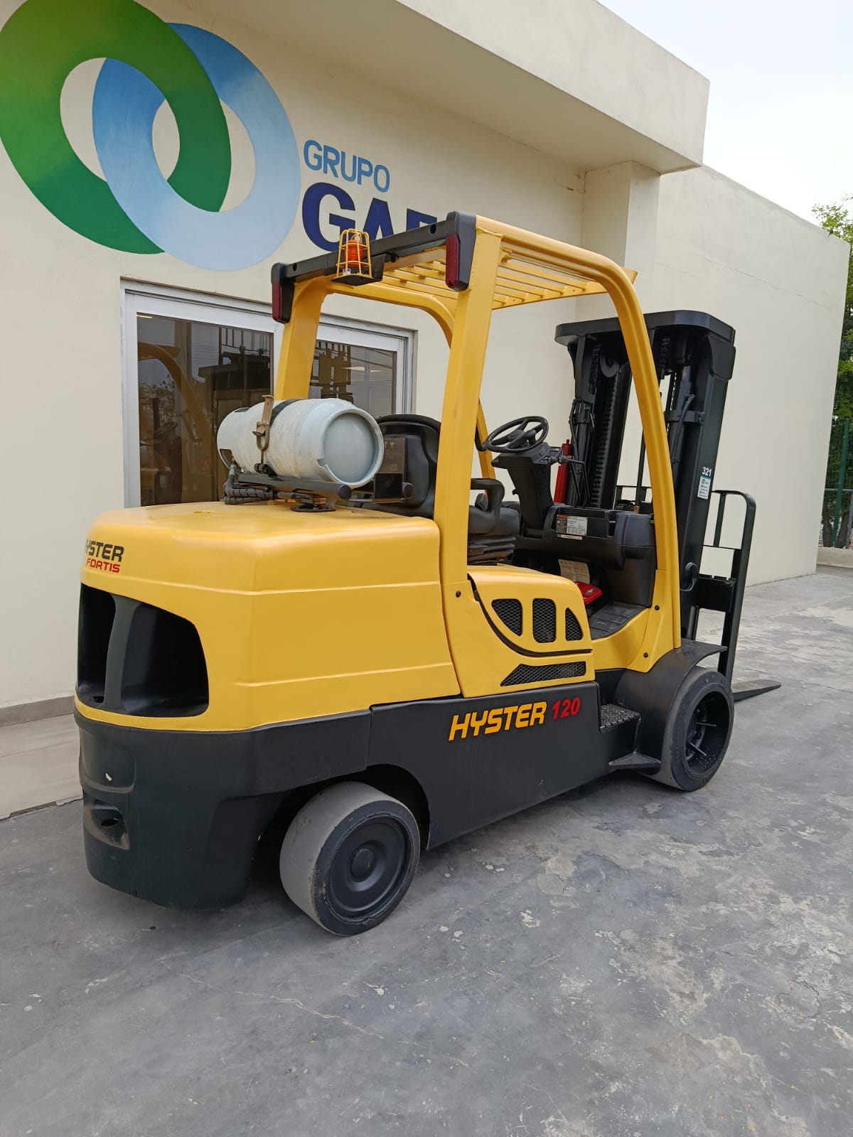 Montacargas seminuevo de tipo combustión a gas LP de la marca HYSTER con llantas cushion e incluye tanque de gas y cuchillas nuevas.